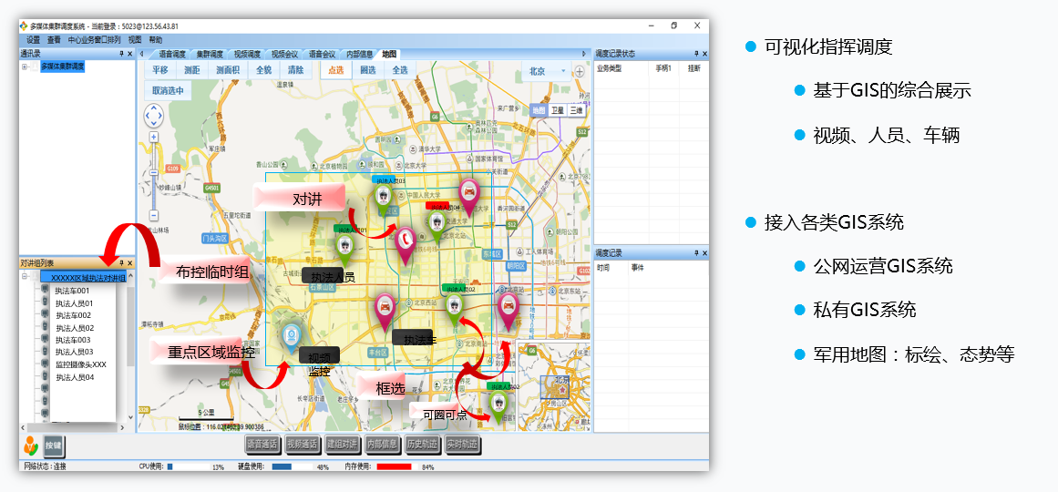 公安局遠(yuǎn)程視頻指揮調(diào)度系統(tǒng),實(shí)現(xiàn)指揮中心同時(shí)對(duì)十幾個(gè)分隊(duì)同時(shí)抓捕行動(dòng)手段支撐,實(shí)現(xiàn)抓捕指令統(tǒng)一下達(dá),統(tǒng)一視頻指揮調(diào)度。